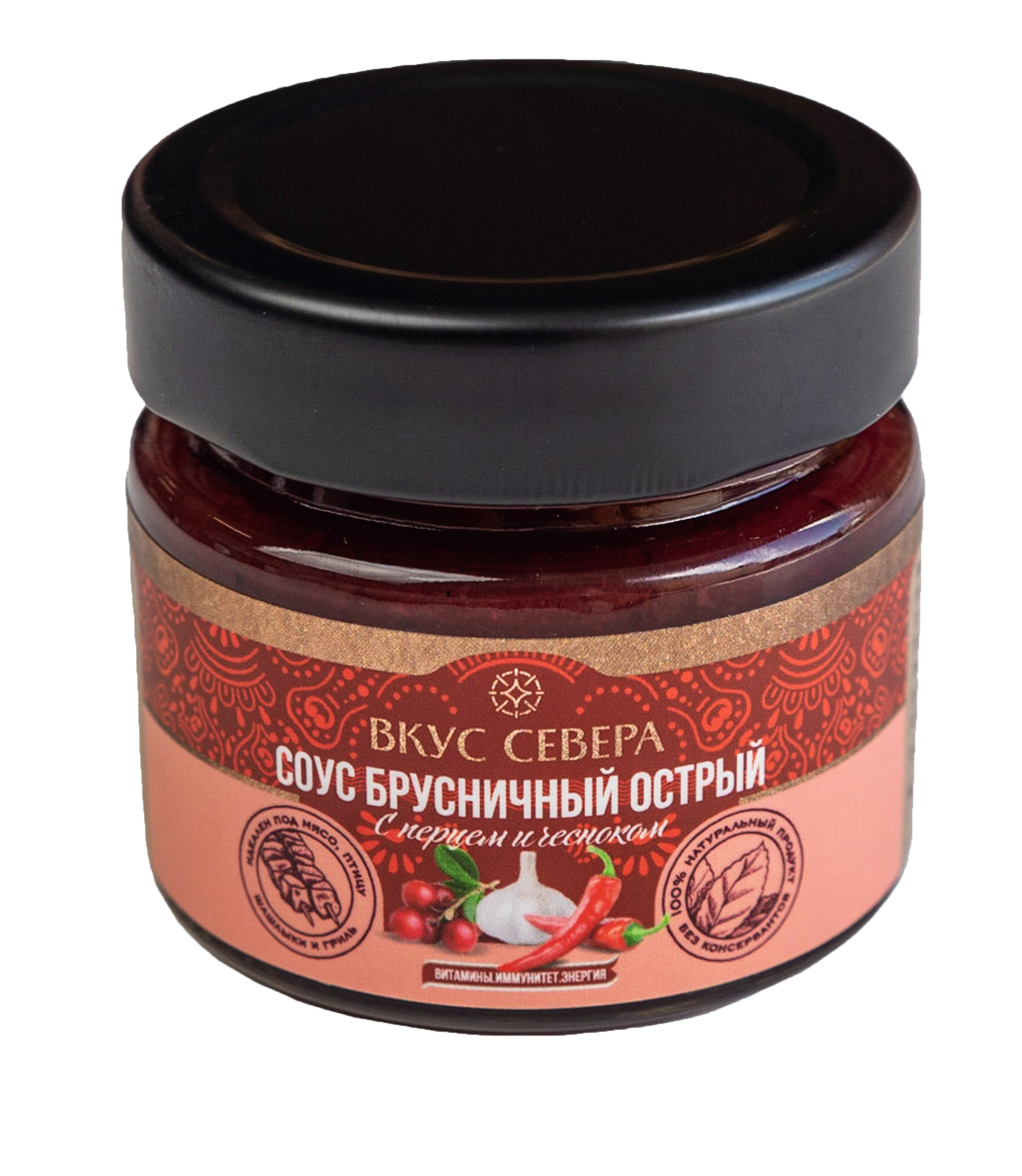 брусника, вода питьевая, сахар, перец острый (чили), мед, чеснок, загуститель пектин, орех мускатный