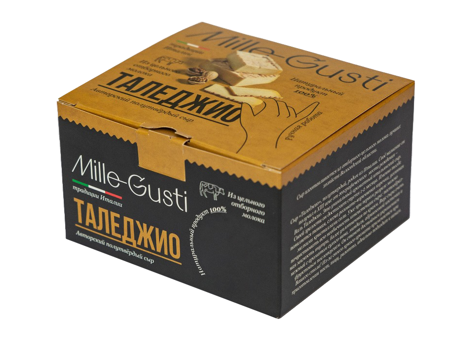 Сыр «Таледжио» относится к категории полутвердых сыров, изготавливается из цельного коровьего молока, без использования растительных жиров, трансжиров и заменителей молочного жира. «Таледжио» - молодой сыр, зрелости он достигает уже через