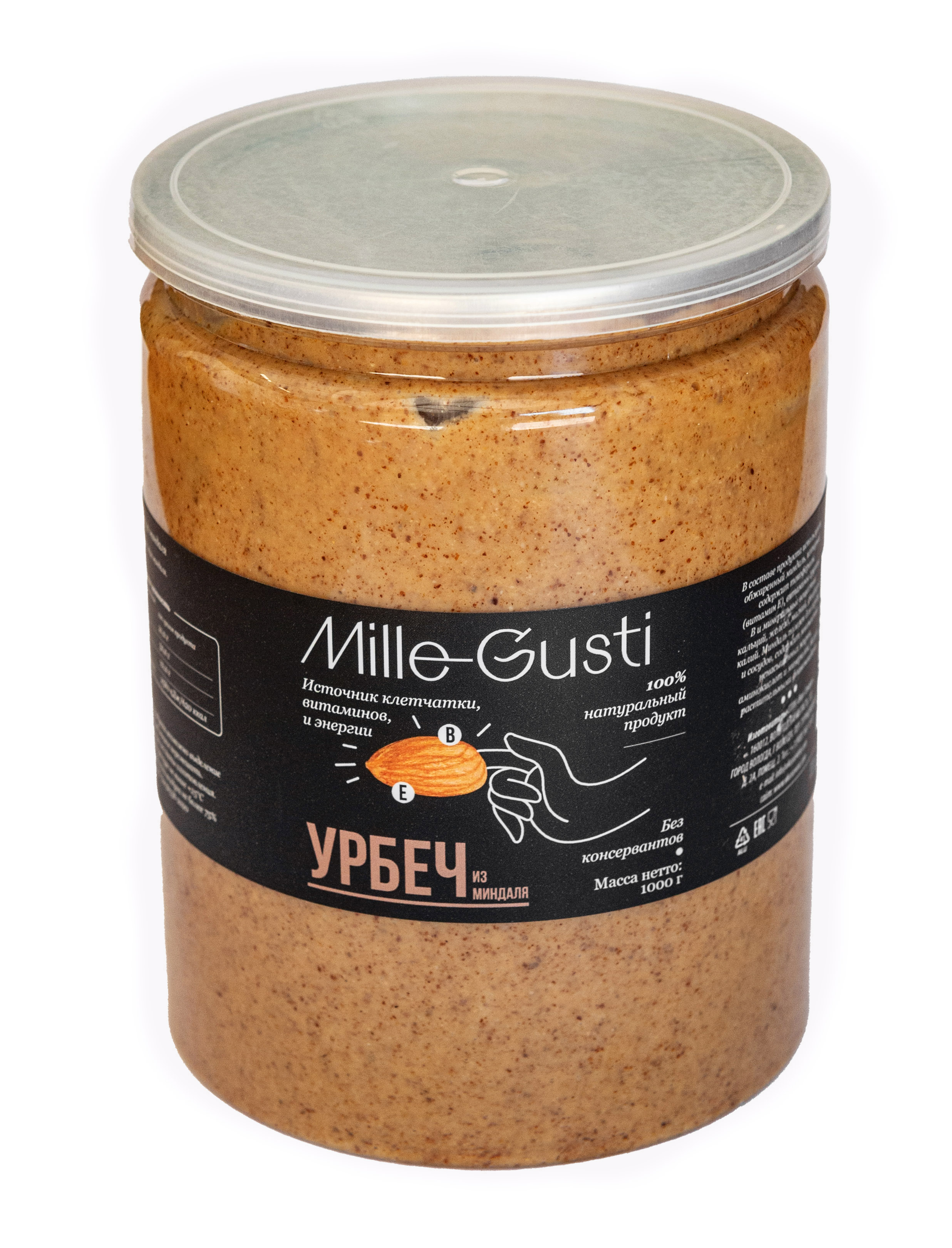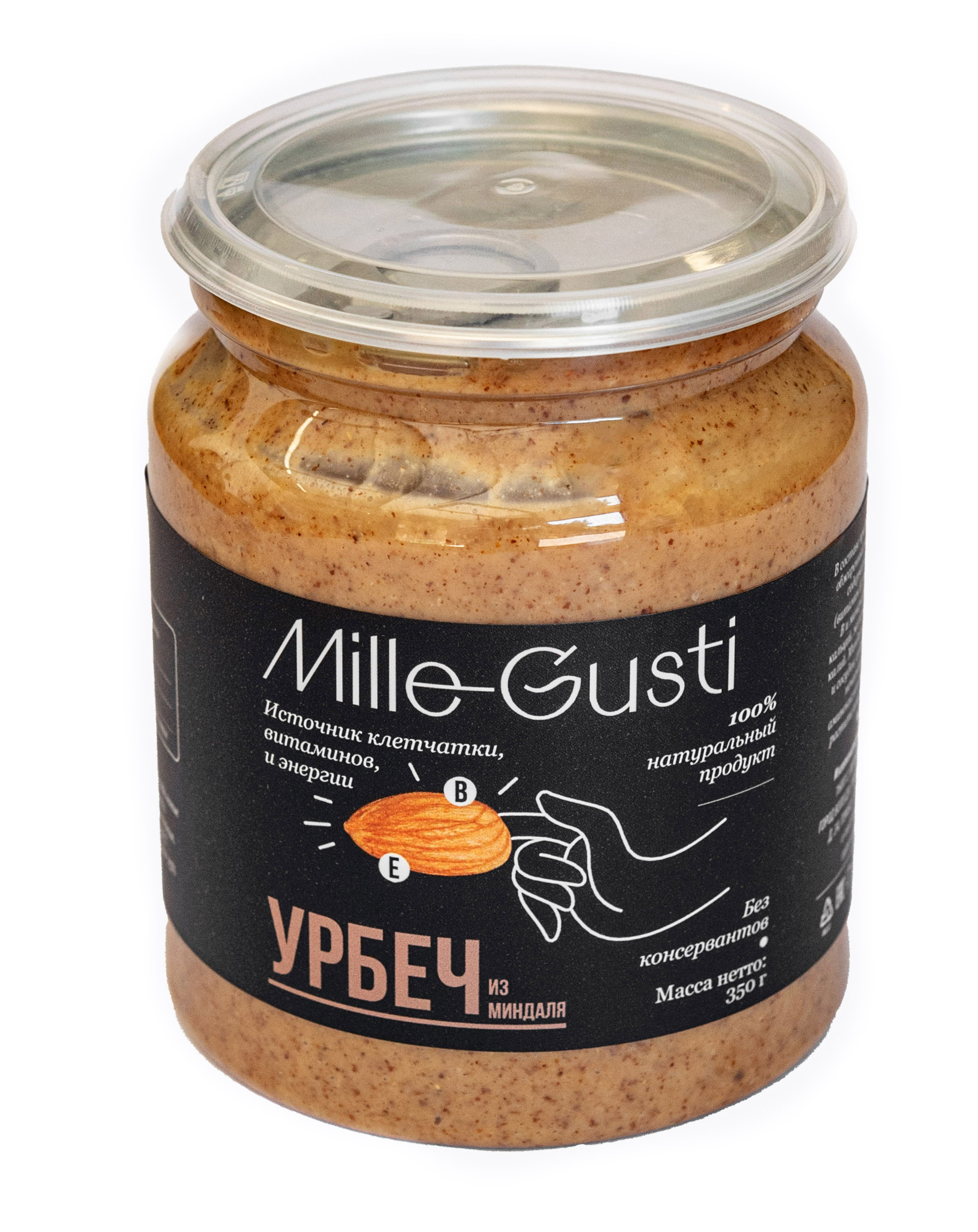 В составе используют свежеобжаренный миндаль, который содержит токоферолы (витамин Е), группы В, и минеральные вещества: кальций, железо, магний, фосфор и калий. Миндаль полезен для сердца и сосудов, тк он содержит множество ненасыщенных жиров, аминокислот и минералов, богаты растительными флавоноидами. Жирные кислоты защищают организм от чрезмерного поступления глюкозы в кров, благотворно влияет на микроциркуляцию и иммунитет. Пасты со временем могут расслаиваться, что свидетельствует о 100% натуральном составе, без добавления консервантов и стабилизаторов.
