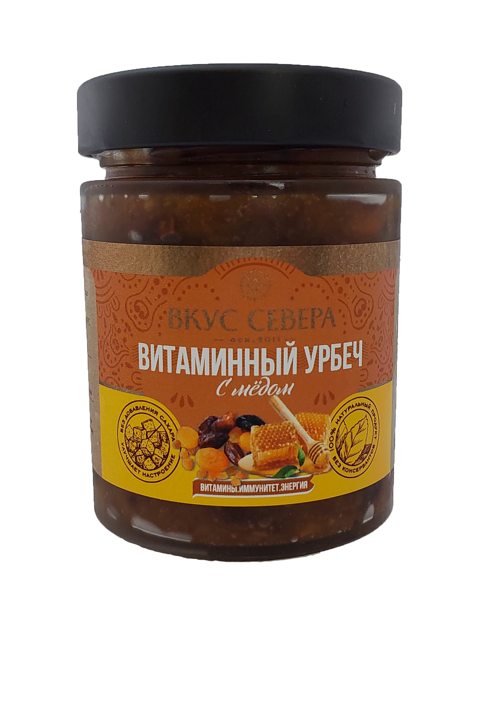 Урбеч изготавливают без добавления сахара. Вместо сахара добавлен натуральный цветочный мёд. В меде содержится много витаминов и микроэлементов, таких как - витамины группы В, витамины А, Е, К, С, РР, яблочная и лимонные кислоты, сахароза, фруктоза, глюкоза, цинк, фтор, магний, йод, железо. В составе натуральные ингредиенты курага, изюм, чернослив, которые богаты витаминами и антиоксидантами - А, С, группы В, РР, Е. Так же в составе присутствует натуральный экстракт имбиря, который обладает сильным антибактериальным действием, способствует снятию воспалений, укрепляет иммунитет, обладает согревающим эффектом. Вегетарианский продукт, улучшает настроение. Урбеч можно добавлять в чай или намазывать на хрустящий багет.